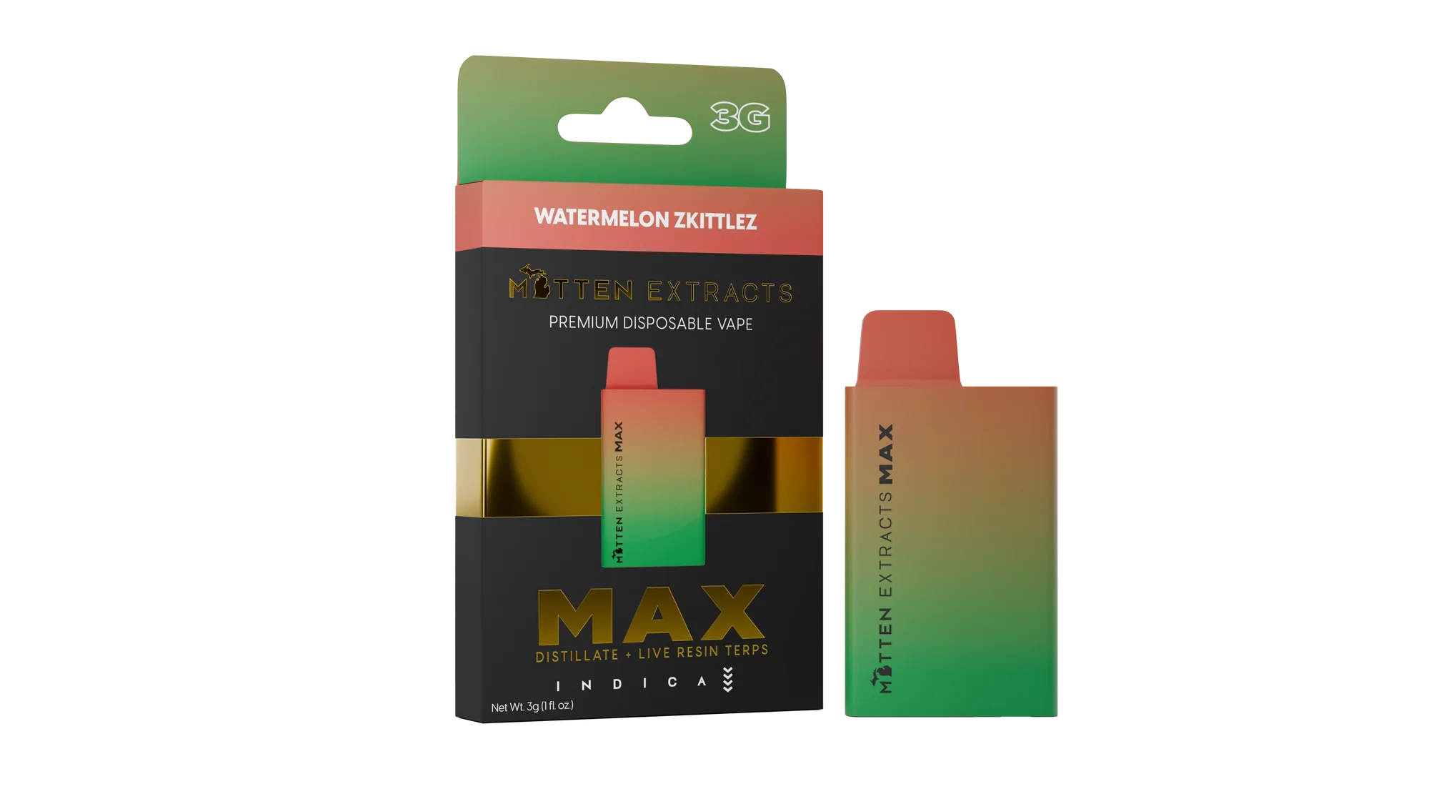 Unwind and enjoy a flavorful cannabis experience with the Mitten Extracts MAX Disposable – Watermelon Zkittlez 3g (Indica). Crafted for cannabis enthusiasts seeking convenience, potency, and a delicious flavor profile, this disposable vape delivers smooth Indica effects in a sleek, ready-to-use device.