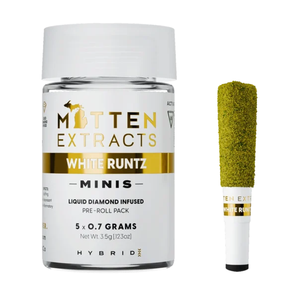 Looking for a convenient, flavorful, and powerfully infused pre-roll experience? The Mitten Extracts Minis Infused Pre-Rolls – White Runtz 5-pack delivers premium potency in a compact size that’s perfect for on-the-go enjoyment. Crafted with top-shelf flower and infused with high-quality distillate and natural terpenes, each mini pre-roll offers smooth, consistent hits and a delicious flavor profile true to the legendary White Runtz strain.