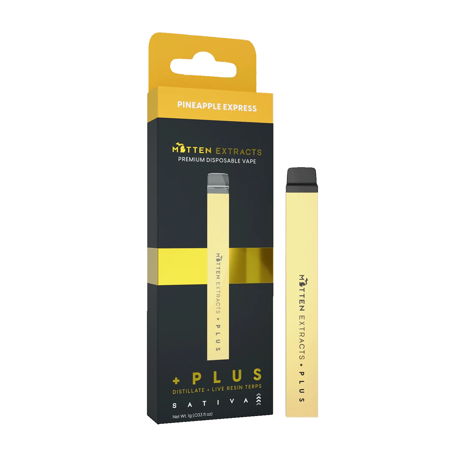 Ignite your creativity and energize your day with the Mitten Extracts + Plus Disposable Pineapple Express 1g (Sativa). This premium disposable vape combines potent Mitten Extracts distillate with the iconic tropical flavor of Pineapple Express, delivering smooth, flavorful hits and uplifting sativa effects in a convenient, ready-to-use device. The +Plus hardware ensures consistent vapor, enhanced airflow, and a clean, satisfying experience from the first puff to the last.